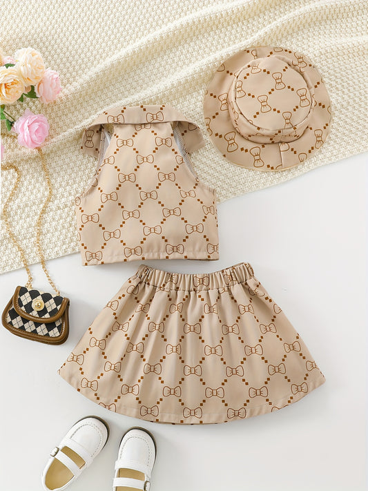 3-Piece Set, Sweet Bows Print Lapel Sleeveless Vest + Short Skirt + Hat - Spring/ Summer Clothes, Girls Outfit, Gift